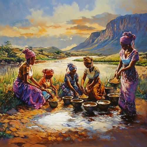 a painting of a group of beautiful ancient african women using rhassoul clay powder in ancient south africa. it is glistening because of how healthy it is. it is in a beautiful south african environment