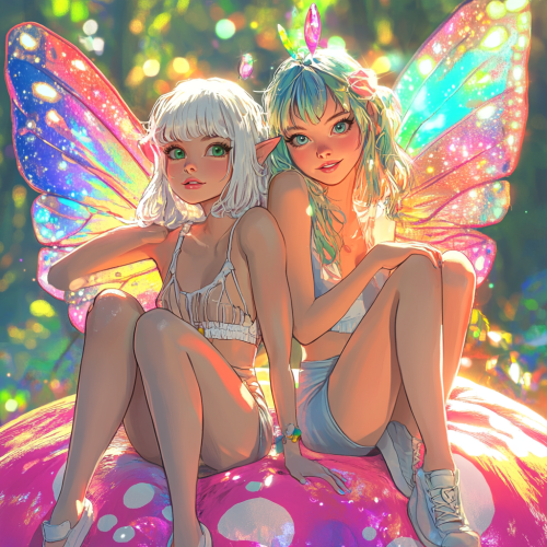An animation of two anime cartoon style beautiful pixie women sitting on a giant pink toadstool. One of the women has green eyes and shorter white hair. The other woman has blue eyes and longer blonde hair. Both of them are wearing cute modern outfits and have big beautiful fairy wings. LSD trip, trippy, psylicybin, lazy afternoon, sunlight, high contrast, shiny, bubbly, sparkly, rainbows, marijuana.