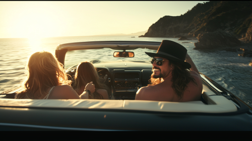 Kid Rock in a Convertible driving down the coast with a bunch of beautiful women midriff showing, dynamic lighting, 8k, UltraHd --ar 16:9 --q 2 --v 6.1 --style raw --s 50