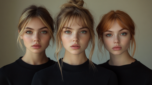 front view on three females, one 22 years young attractive girl looks like Florence Pugh blonde mikado with fringe hazelnut eyes dressed on black shirt tanned skin, second female porcelaine perfect skin big green eyes hair on bun dressed on black shirt, three female is ginger pixie cut hair blue eyes dressed black shirt, perfect features, , caravaggesque chiaroscuro, by Charlie Bowater, Eve Ventrue, Fernanda Suarez --ar 16:9 --stylize 300 --v 6.1