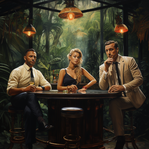3 men sitting at the bar, ultra realistic, with beautiful women, with a jungle behind them
