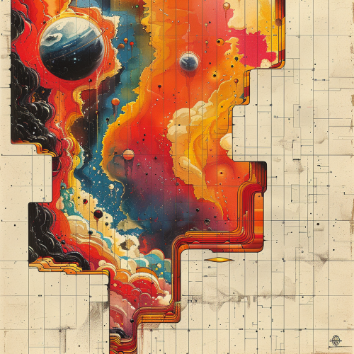 Create a kinetic art piece featuring an array of floating geometric shapes reminiscent of machine parts, rendered in a palette of earth tones accented with sky blue and coral red
