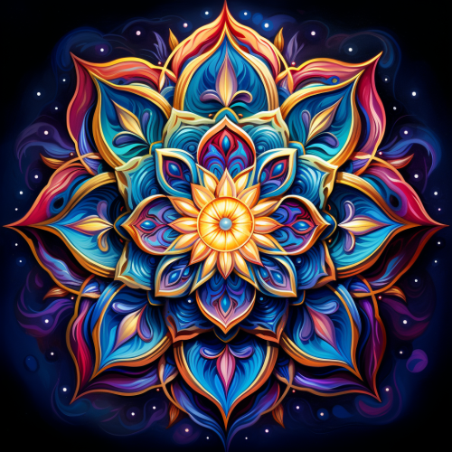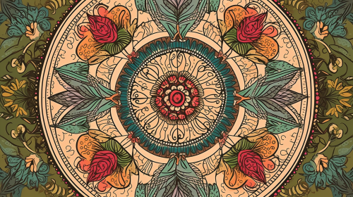 A captivating painting in the realm of patterns and mandalas, with vibrant colors and intricate designs that radiate outward, evoking a sense of energy and spiritual significance, the artwork invites the viewer to explore the depth and complexity of the mandala's symbolism, Artwork, acrylic on canvas with meticulous attention to intricate details and mandala and floral pattern motifs, --style raw --tile -