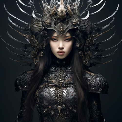 A Korean woman wears intricate fantasy black armor, exuding a sense of power and mystery, photography