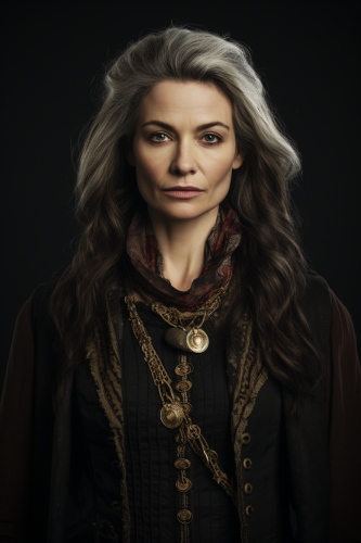 The Actress Aisling Bea as an older travelling trader. Old. Straight grey hair. Very pale. Menacing and angry. Smug. Dressed in plain clothes. Detailed. Painted. In a fantasy style. --ar 2:3