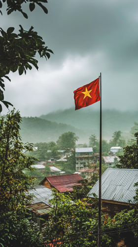 A scene of a rainy day over a rural village, with lush greenery and traditional tin-roofed houses in the foreground. The atmosphere is moody, as heavy rain pours down, softening the colors of the landscape. A tall flagpole rises prominently, holding the red Vietnamese flag with a yellow star at its center, fluttering defiantly in the storm. The sky above is a mix of dark clouds and diffused light, giving the impression of a passing monsoon. The misty background reveals more rooftops and distant structures, evoking a sense of resilience and quiet beauty amid the harsh weather --ar 9:16 --v 6.1