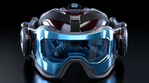 hyper realistic, less detailes, ultra reality, Large VR gaming device, Virtual reality accessed through the VR device, Inside view of the vr device's screen, In VR, there is an interface similar to 'Iron Man's' Jarvis, blue tone, blue and white tone, white background, 16k --ar 16:9