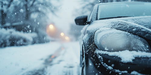 A car seen from the outside in winter, front view focus on the front big window. --ar 2:1 --v 6.0