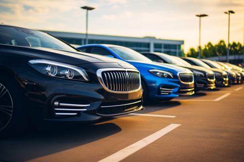 A car dealership with many elegant black and blue cars, there are no people in the image. Cars are not sports cars. The cars are next to each other. The image is clear and bright and is well lit. This image is to be taken as a professional photo shoot using a Canon R6 with a high quality 25mm lens. --ar 3:2