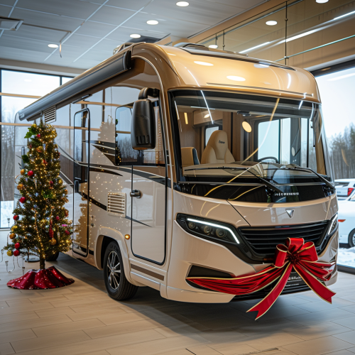 a new Caravan motorhome, a huge festive bow on the car, standing in the sales showroom, ultra-realism, real photo. --s 250 --v 6.0