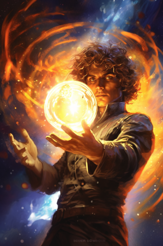 artwork in a space fantasy science fiction card game where you can see a character casting a fireball --ar 2:3 --v 5.1