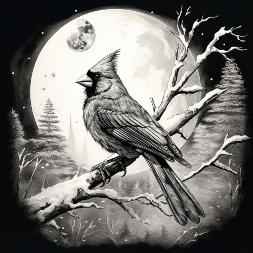 cardinal bird flying in front of a waxing gibbous moon intricate line art black and white portrait drawing realism snowy scene