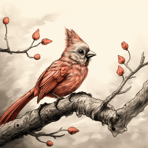 children’s hand drawn illustration of a cardinal hoping along a branch of acorns