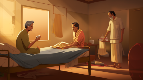 Illustrate people falling ill laying on bed sick and wife standing taking care doctor also treating patient at village in india simple cartoon --ar 16:9