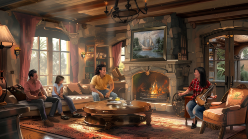 disney style, family sharing a happy moment at the living room --ar 16:9 --v 6.0