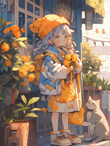 alien artist's rich colors,vibrant colors,nightcore,in the style of small street, a small girl is standing near a roadside booths,wood door and window,cats outside,delicate flora depictions,in the style of bright color palette,magical girl,cute and dreamy,citrine citron,light cerulean,softly luminous,shiny/glossy, ue5,urban environment, uhd image, calming, dreamy,16k, --niji 5 --ar 3:4 --s 352 --relax