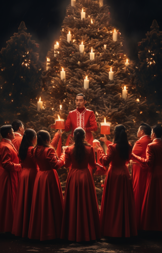 realistic photograph of a group of filipino christmas carolers wearing barong tagalog, singing in front of a giant christmas tree, their backs are against the camera, no faces, dynamic poses, dramatic lighting, cinematic lighting, night time, photography, studio shot, red and gold --ar 9:14