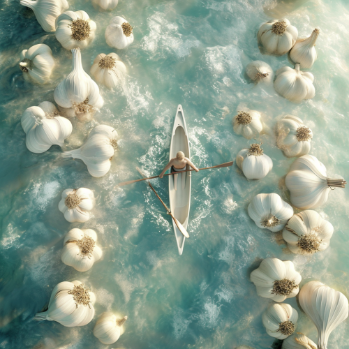 Bird's Eye View, cover of food commercial, showing some garlic forming a river, ultra-realistic garlic cloves, a man rowing in the river, white and light blue, natural light, advertising design poster, movie poster, macro scene, atmospheric, rendered in Cinema4D, texture-based, realistic detail, cinematic lighting, 8k --v 6.0 --s 50