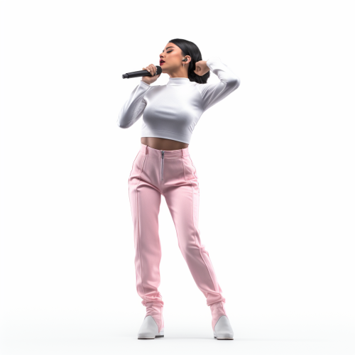 hyperrealistic, 4K, ultra detailed, natural image of a asian female singer with mic, full body, high expression, dancing, looking to camera, depicting the entire full body, set against a pure white background, and ensure the image resolution is 4K