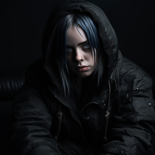 Realistic interview photo style of Billie Eilish in 4K, Dark décor, front shot modeling