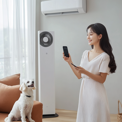 In the living room, there is a stand-type air conditioner in the corner, a sealing fan is attached to the ceiling, and the sealing fan is a model with LED. A Korean woman in her 20s is standing next to her and there is a white Maltese. The woman is holding a remote control and a smartphone in her hand --v 6.1