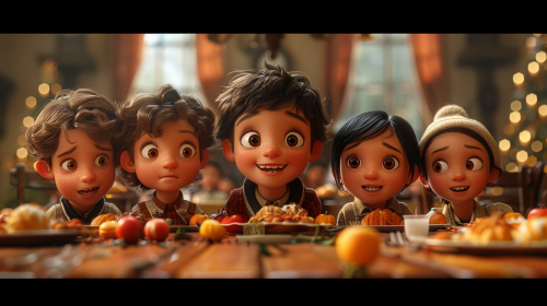 various cartoon Families gathering for a festive dinner, celebrating traditions and togetherness, in the style of animated gifs, clean and simple designs, 3d, one predominant color of orange --ar 16:9 --v 6.0 --s 750