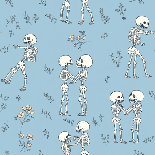 A page of cute cartoon skeleton couples slow-dancing different poses, with a blue background featuring small flowers and leaves. The simple line drawing is in the style of Edward Gorey, with muted colors. --tile