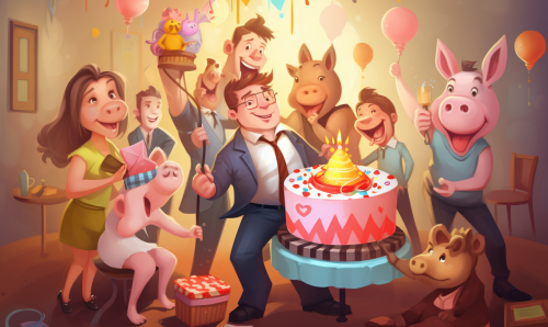 cartoon style, characters celebrating a very fun birthday holding piggy bank, --ar 5:3