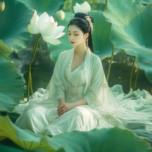 A beautiful woman in traditional Hanfu sits on a lotus leaf, The background features green leaves and white lotus. The style is surrealistic photography, with high-definition quality, a full-body portrait,soft lighting, delicate texture, elegant movements, and a mysterious atmosphere.--ar 9:16 --v 6.1