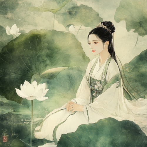 A beautiful woman in traditional Hanfu sits on a lotus leaf, The background features green leaves and white lotus. chinese ink wash painting style, a full-body portrait,soft lighting, delicate texture, elegant movements, and a mysterious atmosphere.--ar 9:16 --v 6.1