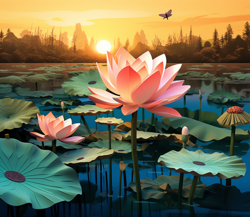 side view low-angle extreme closeup illustration of fully opened lotus flower on calm water. Sunset in the background other lotus flowers are starting to bloom. A dragonfly sitting on a nearby leaf. illustration made with paper cutouts --ar 22:19 --v 5.1