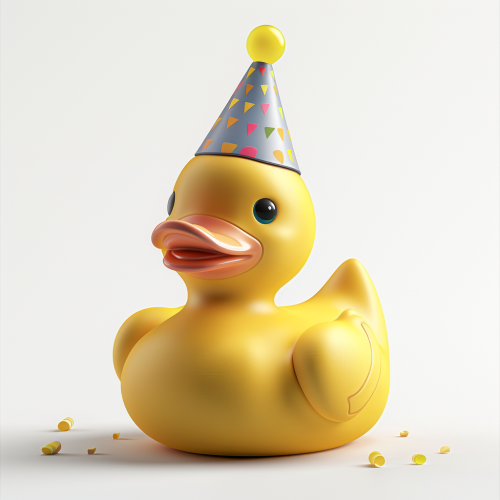 a birthday rubber ducky wearing a party hat, photorealistic bright fun, white background --s 250 --v 6.0