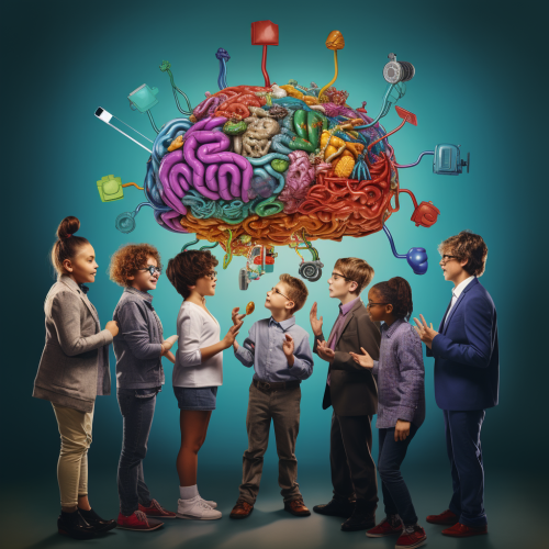 various curious cool students from different professions and backgrounds in wonder discussing the huge brain in the middle of them - Brain Myths or Brain Facts?, colorful, fun, cheerful, high-definition image