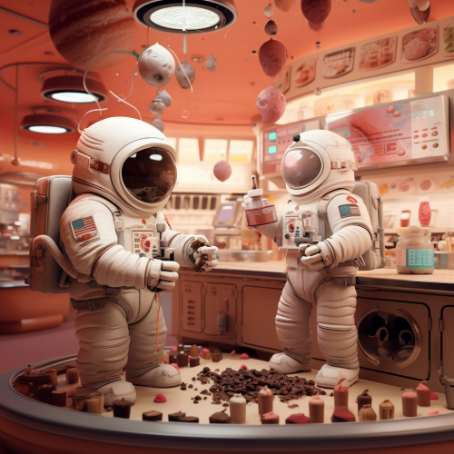 brown kraft paper pints, all with lids, stacked in a pyramid on a white marble counter with a dark background, lit from the side, pints are plain in color without texture, hyperrealistic cartoon style, no ice cream showing from top
