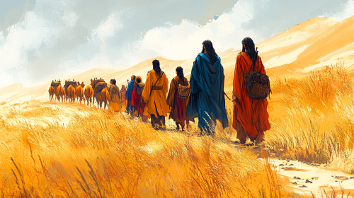 "A cartoon-style illustration of Abraham and his family journeying through the desert towards the Promised Land. The image should show the characters from behind, highlighting their backs as they walk across the golden sand dunes. Abraham, wearing traditional robes and a long beard, leads the way with a determined stride. His wife Sarah and other family members follow, each dressed in colorful, simplified ancient attire. The caravan includes cheerful, cartoonish camels carrying supplies and tents. The sky is bright and clear with a hint of a setting sun casting a warm, golden light over the scene. The overall mood is adventurous and hopeful, with playful, child-friendly elements. --ar 16:9 --s 1000