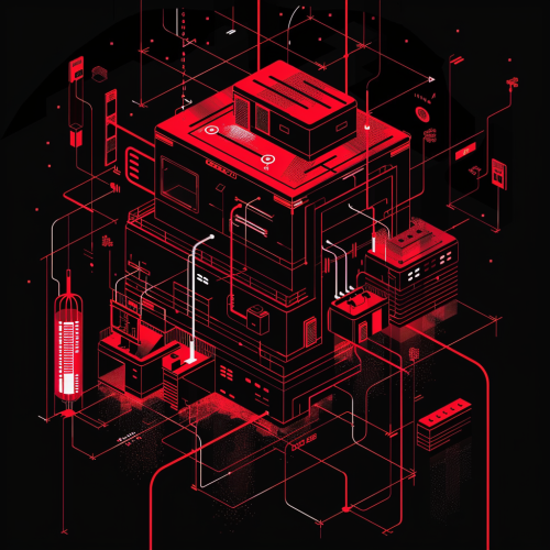 isometric graphic with a digital schematic of a building. No people. No text. Dark mode. Use red and white highlights (this red: #C9242C)