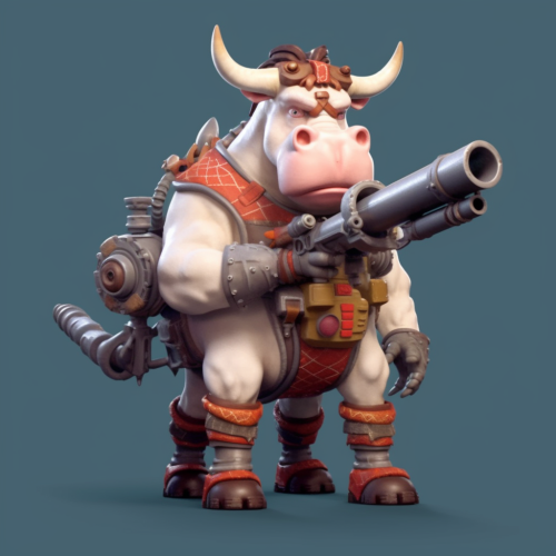 humanoid cow holding a bazooka. strong muscle man physique of a cow man. cartoon. anime --s 750 --v 5.1