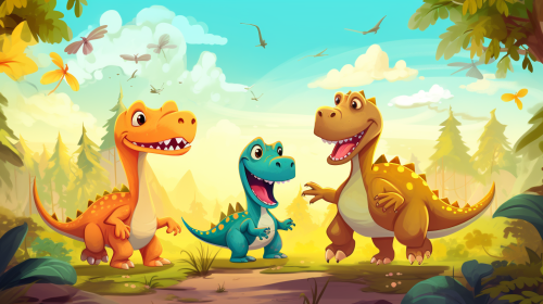Cartoon dinosaurs in jungle: T-Rex roar, triceratops eat grass, teradactal fly.