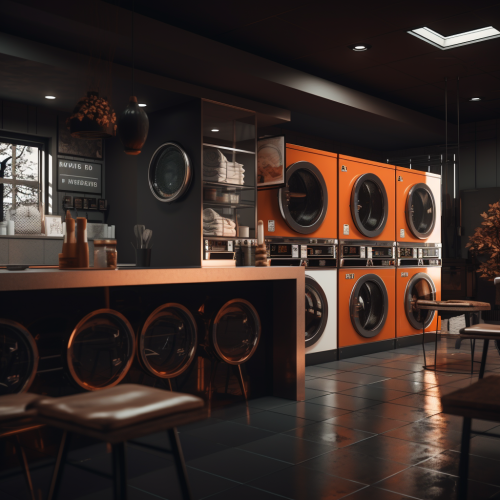 male model in the style of vogue magazine standing behind a washing machine in a laundromat. High definition. 8k resolution