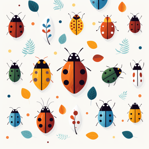 Create a bright, minimalistic, cartoon print for a children's clothing line using a nature theme, beetles and ladybugs on a white background