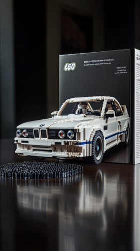 The LEGO box for the Cream white BMW M3 E30 car, placed next to it is also a LEGO set of all parts and components in front of them. The packaging features realistic photography style, high resolution, and the Lego product has a dark background with light shining on its surface.high quality --ar 9:16