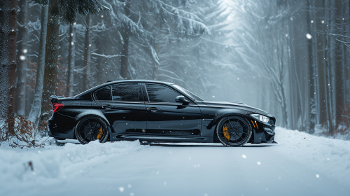 a side shot of a black slammed lowered 2016 BMW M3 sedan driving in a snowy forrest --ar 16:9 --s 250 --v 6.0