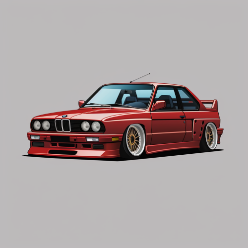 dark green, bmw e30 m3, cartoon, minimalist, lowered and with golden aftermarket wheels, white background