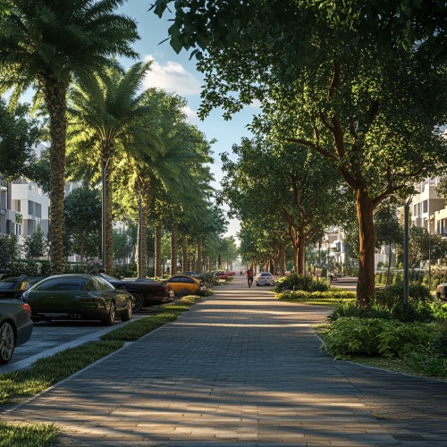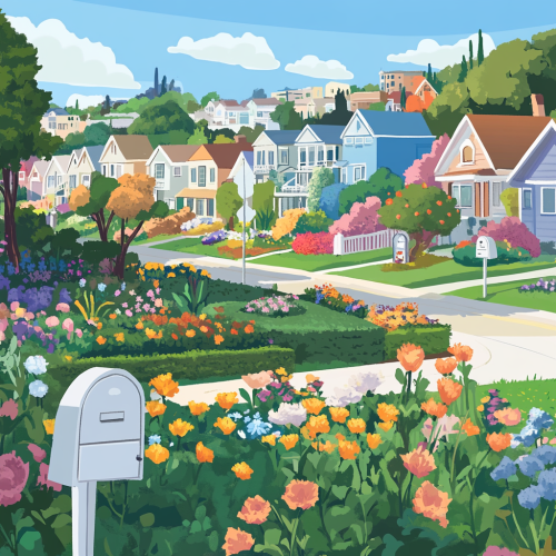 illustration of a city park, flowerbed in the middle, small town, beautiful california landscape, daylight, and blue sky, where each address has a white mailbox by the street. In the vibrant and exaggerated animation style of the 'Shark Tale' cartoon, cartoonish manner, inviting colors, a cartoon style characteristic of kids' book illustrations