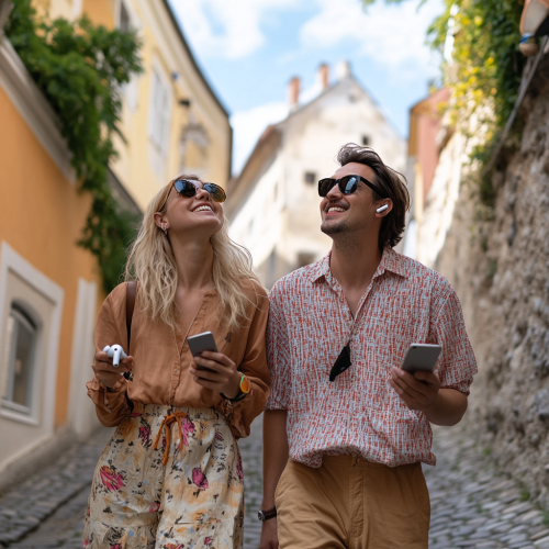 Capture a 30-year-old man and woman as tourists in a small European town. They are walking joyously along a cobblestone street, both looking upwards with smiles, wearing sunglasses. The woman is blonde with long hair, and the man is Caucasian. They are dressed in casual, comfortable outfits, suitable for sightseeing. Both are wearing Apple AirPods and holding smartphones. The image is crafted with a photographic portrait quality. The scene is captured in photorealistic detail using a 35mm lens at f/1.8 aperture, creating a shallow depth of field. This keeps the subjects' features sharp while softly blurring the background, emphasizing the atmosphere and their expressions. The image is beautifully color corrected for a cinematic look. Settings include: 35mm, f/1.8, 8k resolution, hyper-realistic texture aspect ratio 4:7