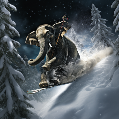 elephant skiing and crashing into a tree, and wrapping around the tree on a solid black background, photorealism