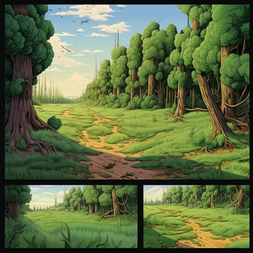 I wanna make a 4 sequential image, please make every image's style is connected to the other image, mood of the image is in cartoon style 2nd Image: The bushes seem to rustle and move as if something is hiding within them