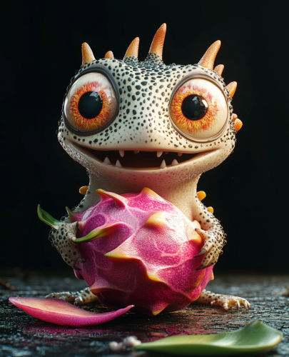 black background. a humorous copybara with bulging eyes pulls a piece of dragon fruit. Pixar engine, cartoon caricature design. --ar 179:220 --stylize 250 --v 6.1