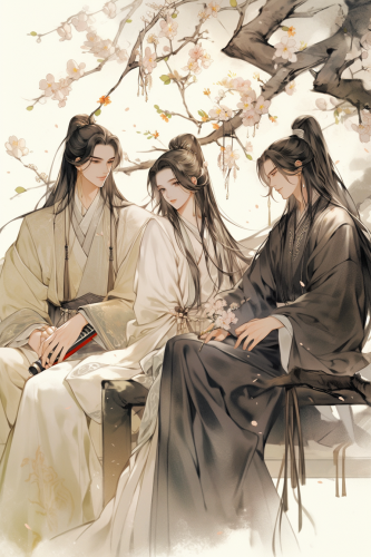 Chinese painting people in Hanfu, the three men with one woman, sitting down under the blossom tree, high angle shot, the men with long straight hair, the men have half tie hair, tall guys, elegant, korean beauty, fair and smooth skin, sharp eyes, finely detailed eyes, manhwa, sweet and romantic atmosphere, can't imagine how beautiful this is, best quality, highres, 8k, simple background, white space --niji 5 --ar 2:3