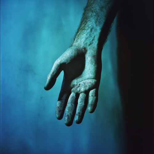 wolfgang tillmans photograph, discolored, bruised hands emerging from void, soft lighting, fingers limp like god reaching out to touch david toward camera, blue tones, melancholy